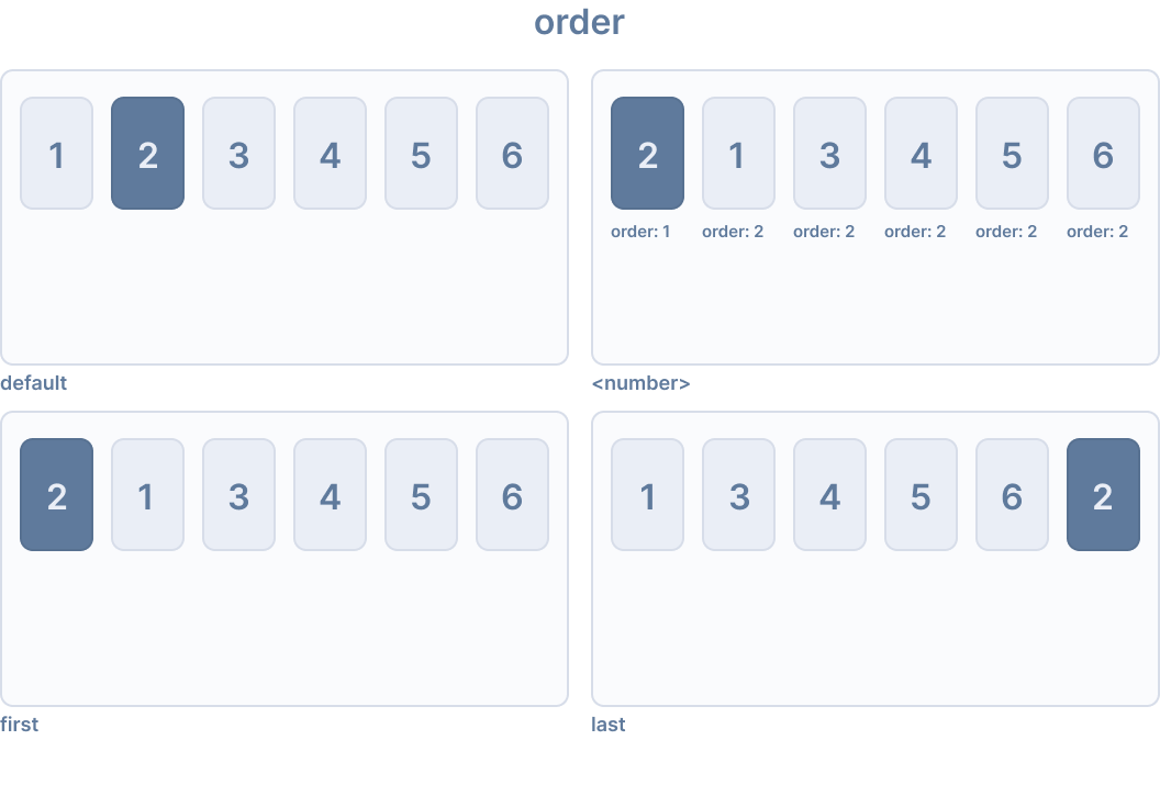 order CSS プロパティは、flex またはグリッドコンテナ内でアイテムをレイアウトする順序を設定します。コンテナ内のアイテムは、昇順のorder値で並べ替えられ、次にソースコードの順序で並べ替えられます。明示的なorder値が指定されていないアイテムには、デフォルト値0が割り当てられます。